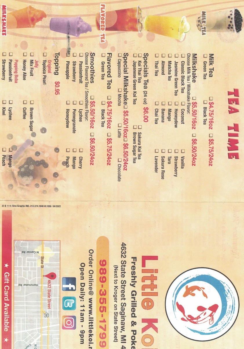 Welcome to Little Koi Restaurant, your go-to destination for delightful poke bowls and refreshing milk teas in Saginaw, MI. Located at 4632 State St, this cozy spot offers a menu bursting with personalization options. Choose between regular (24oz) or large (32oz) poke bowls, and let your creativity shine by customizing your bowl with various proteins, sauces, and toppings. Priced at $13.75 and $16.75, the flavors are as vibrant as the experience.
